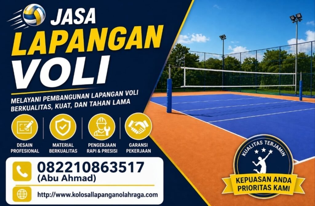 Disini kami Cv. Cahaya Cipta Mandiri menawarkan jasa pembuatan lapangan voli indoor maupun outdoor dengan harga terjangkau. Kami memiliki tenaga ahli dan profesional yang siap mengerjakan pembuatan lapangan voli di seluruh wilayah di indonesia. Anda sudah tidak perlu repot lagi mencari tukang, karena disini anda tinggal menerima lapangan bila sudah siap pakai, semua kebutuhan lapangan akan diurus oleh kami.