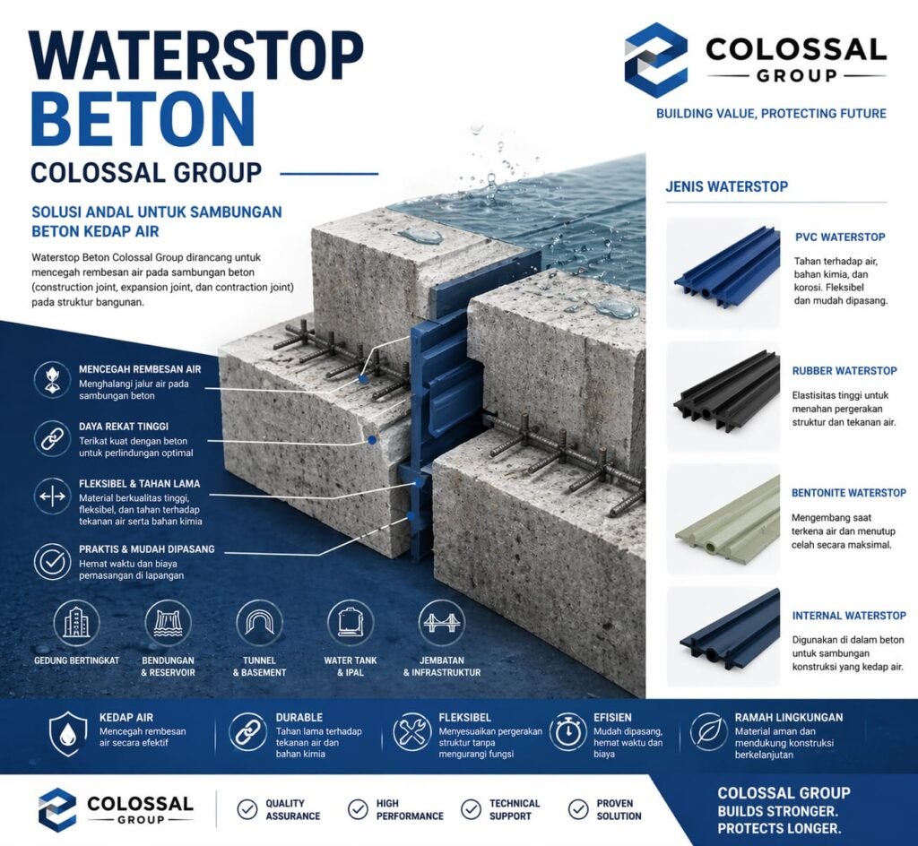 Waterstop adalah salah satu bagian dari waterproof system’ Pekerjaan Konstruksi khusus perbaikan kebocoran terhadap Konstruksi struktur beton dan kami CV. CAHAYA CIPTA MANDIRI sebagai salah satu perusahaan kontraktor Pekerjaan Waterproofing khusus nya Pekerjaan Waterstop terhadap struktur beton bertulang yang berpengalaman dan profesional di bidang Waterstop.